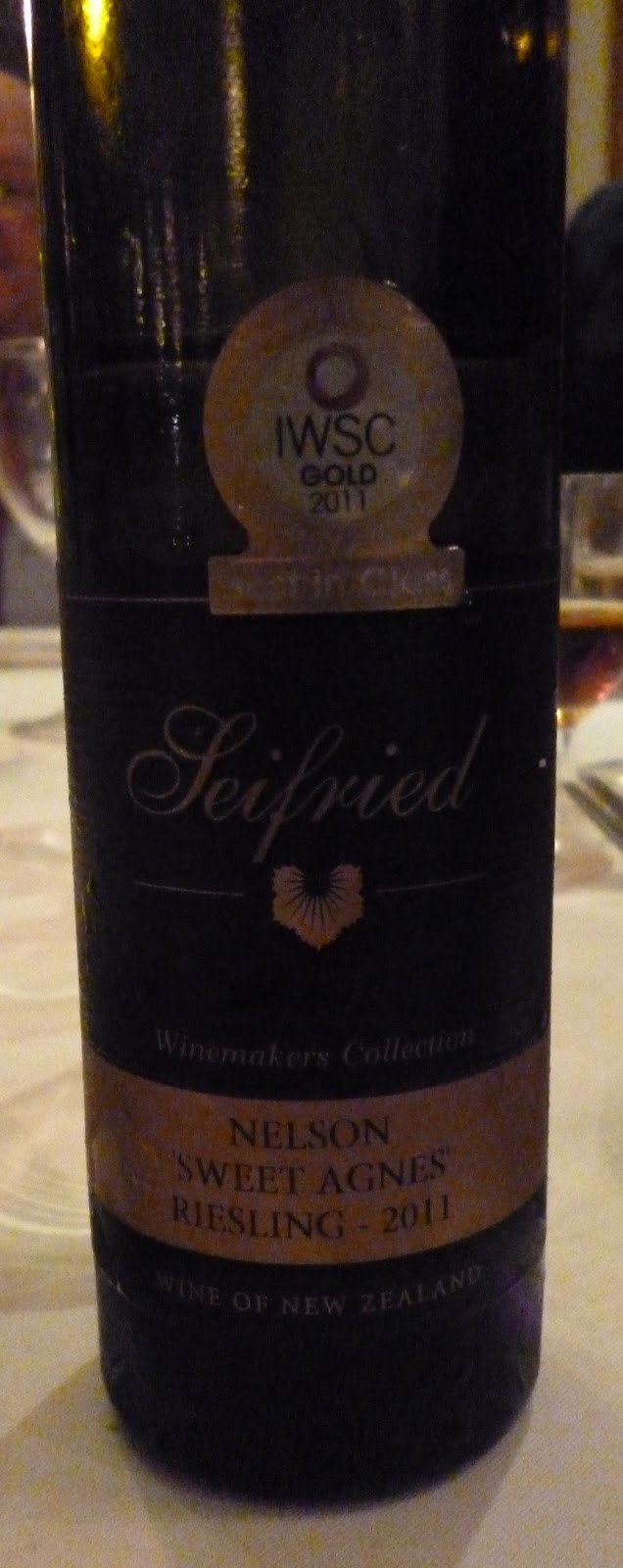 Finally, we had this Seifried Nelson "Sweet Agnes" riesling 2011 provided by G. Hmmm. Quite a contrast. I appear to have quoted some lyrics from "Firestarter" in the book which was my way of referring to the petrol-like quality it had. ACC just wrote "Shell". It wasn't my cup of tea at all. Some of the others didn't dislike it, and to be fair, it probably suffered from comparison with the other sweet wines we'd just had - it was a mere nipper by comparison.