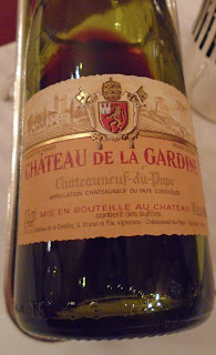 With our cheese, we had this half of Chateau de la Gardine Chateauneuf-du-Pape, in the spirit of trying to drink at least one local wine. As Chateauneuf goes, this was a good one, but I confess that the southern Rhone isn't my favourite, and I think G maybe liked it more than I did. It was a decent choice under the circumstances.