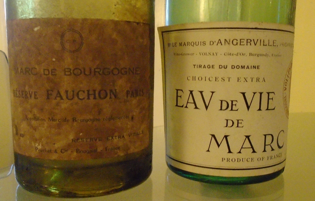 The fossilised cork also appealed to me, although it did cause problems by falling into the bottle and the marc had to be decanted into a different bottle. We noticed that the bottle had a huge punt, and G got down the old Marquis D'Angerville bottle to compare. A distinct similarity there.